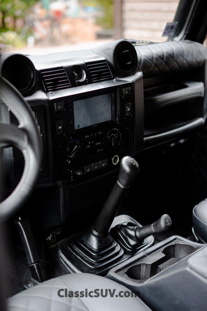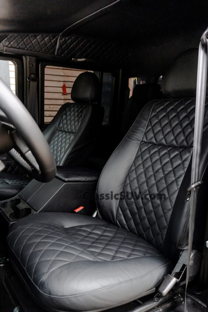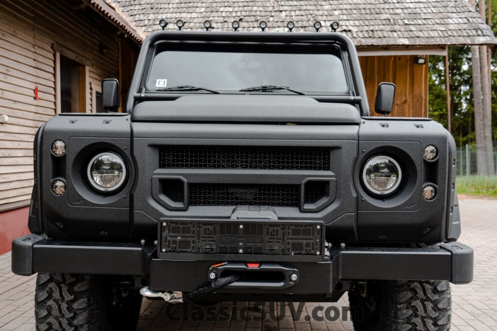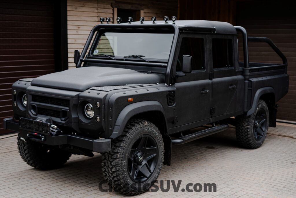 The Custom-Built Land Rover Defender 130 features a restored 2.2L turbocharged engine and a 6-speed manual transmission. Key upgrades include a suspension lift kit, dual Warn winches, and a custom interior, combining rugged performance with versatility. Wide Body and Black 3D Paint.